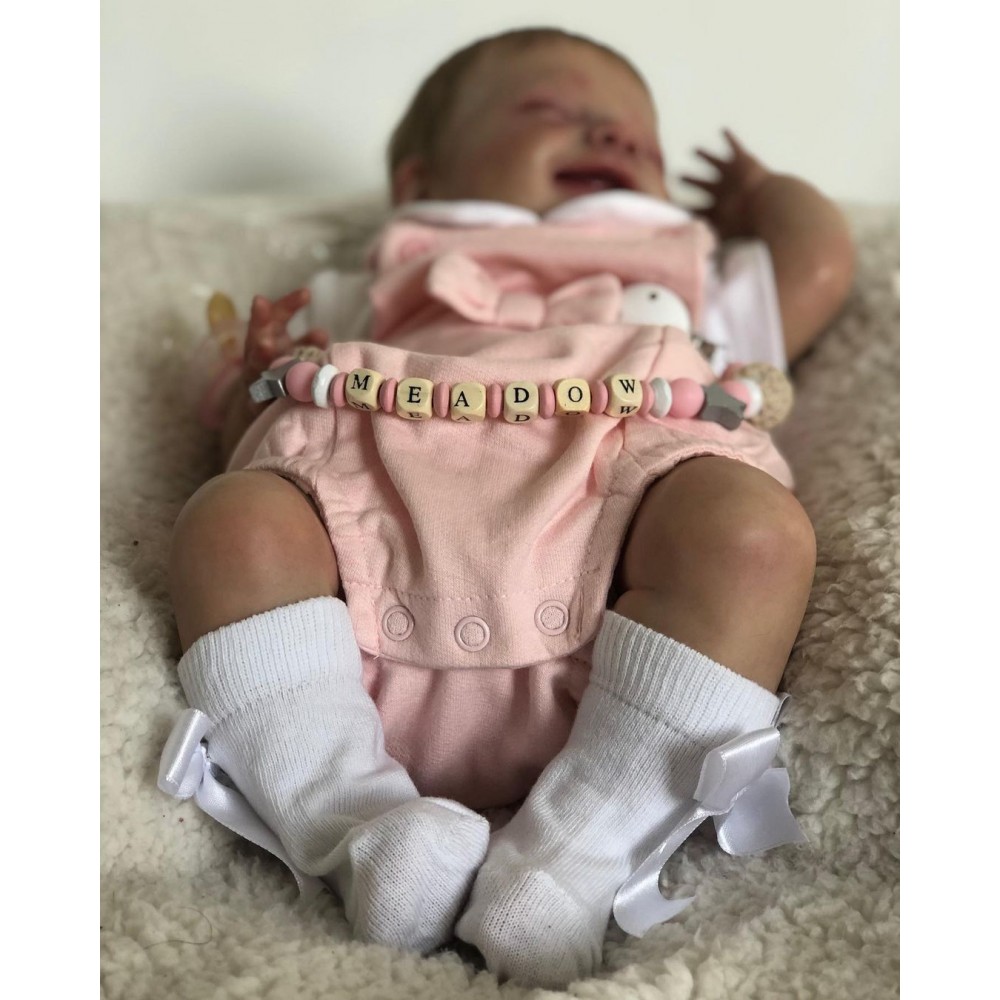 April falls asleep in the comfort of your arms. Her soft body is wrapped in soft and comfortable clothes, and she enjoys the sweet world of her dreams. She is absorbed in her beautiful dream, with a smile as sweet as a picture, and it's the manifestation of a child's first hopes for the world. April's body is soft, her legs are curled up, her nose and cheeks are a little blushed, we haven't forgotten these little details, and the smell of baby talcum powder around her makes everything more realistic. April, born in spring with sweet dreams, is our little smiling angel.