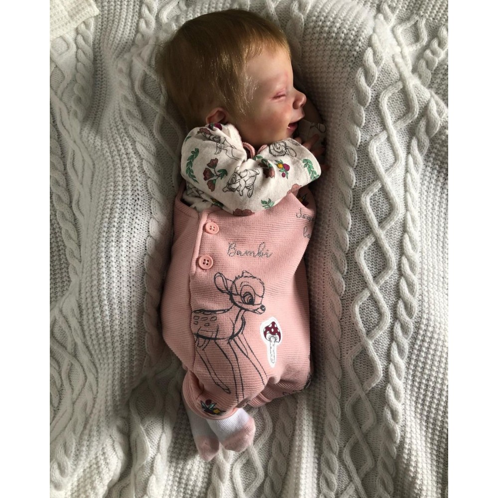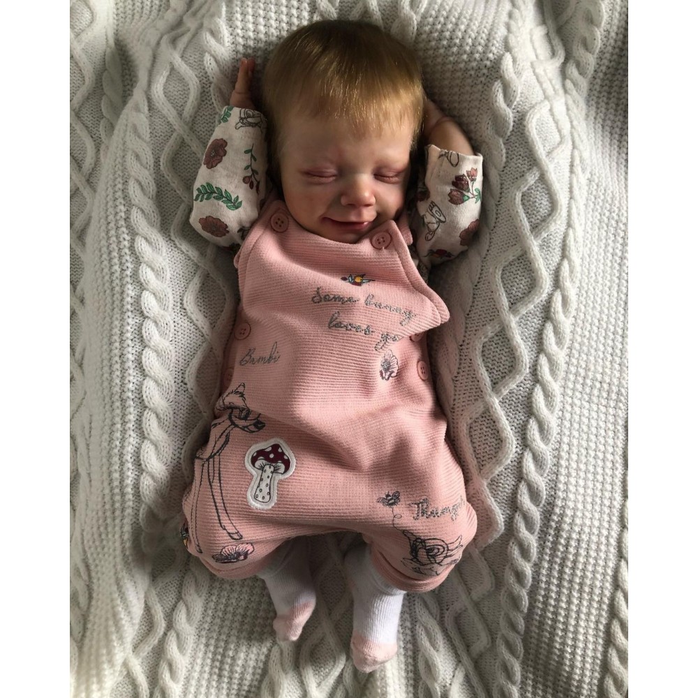 April falls asleep in the comfort of your arms. Her soft body is wrapped in soft and comfortable clothes, and she enjoys the sweet world of her dreams. She is absorbed in her beautiful dream, with a smile as sweet as a picture, and it's the manifestation of a child's first hopes for the world. April's body is soft, her legs are curled up, her nose and cheeks are a little blushed, we haven't forgotten these little details, and the smell of baby talcum powder around her makes everything more realistic. April, born in spring with sweet dreams, is our little smiling angel.