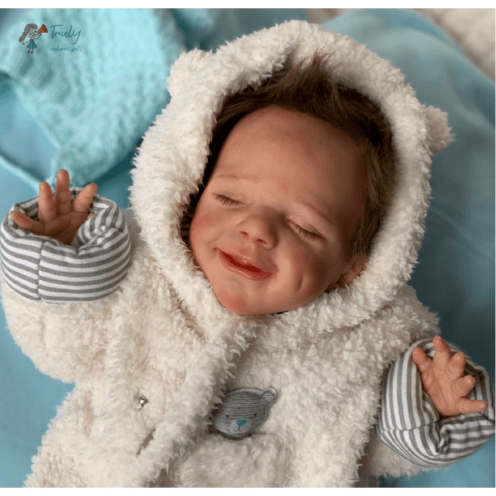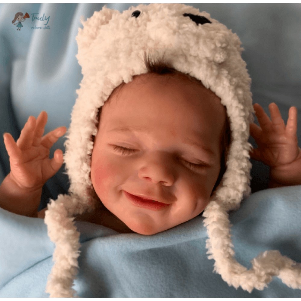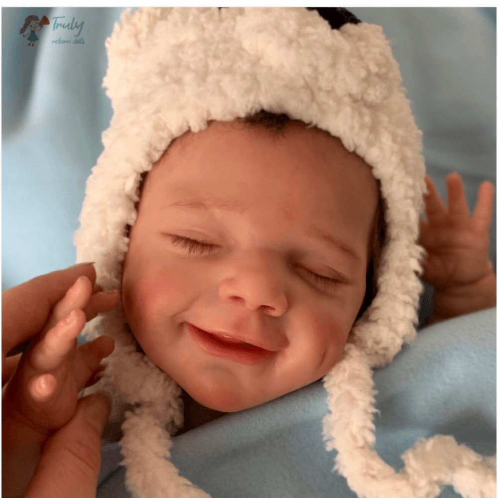 April falls asleep in the comfort of your arms. Her soft body is wrapped in soft and comfortable clothes, and she enjoys the sweet world of her dreams. She is absorbed in her beautiful dream, with a smile as sweet as a picture, and it's the manifestation of a child's first hopes for the world. April's body is soft, her legs are curled up, her nose and cheeks are a little blushed, we haven't forgotten these little details, and the smell of baby talcum powder around her makes everything more realistic. April, born in spring with sweet dreams, is our little smiling angel.