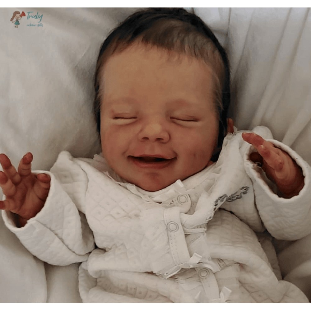 April falls asleep in the comfort of your arms. Her soft body is wrapped in soft and comfortable clothes, and she enjoys the sweet world of her dreams. She is absorbed in her beautiful dream, with a smile as sweet as a picture, and it's the manifestation of a child's first hopes for the world. April's body is soft, her legs are curled up, her nose and cheeks are a little blushed, we haven't forgotten these little details, and the smell of baby talcum powder around her makes everything more realistic. April, born in spring with sweet dreams, is our little smiling angel.