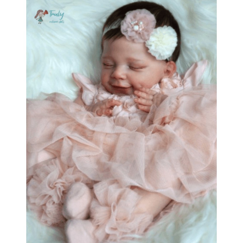 April falls asleep in the comfort of your arms. Her soft body is wrapped in soft and comfortable clothes, and she enjoys the sweet world of her dreams. She is absorbed in her beautiful dream, with a smile as sweet as a picture, and it's the manifestation of a child's first hopes for the world. April's body is soft, her legs are curled up, her nose and cheeks are a little blushed, we haven't forgotten these little details, and the smell of baby talcum powder around her makes everything more realistic. April, born in spring with sweet dreams, is our little smiling angel.